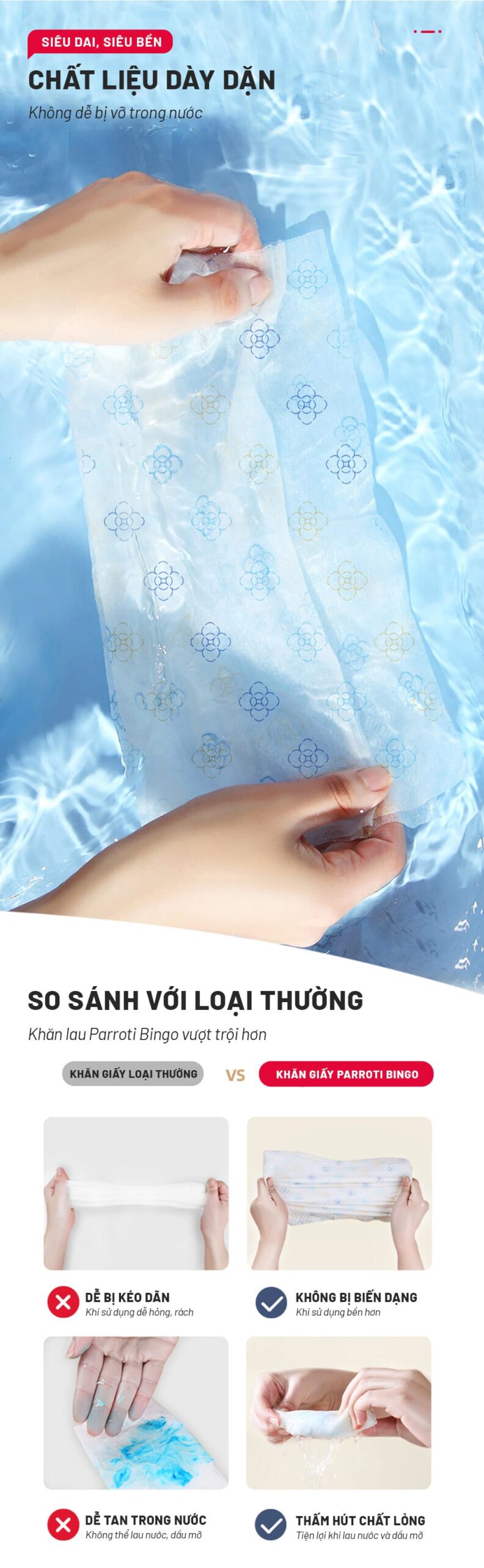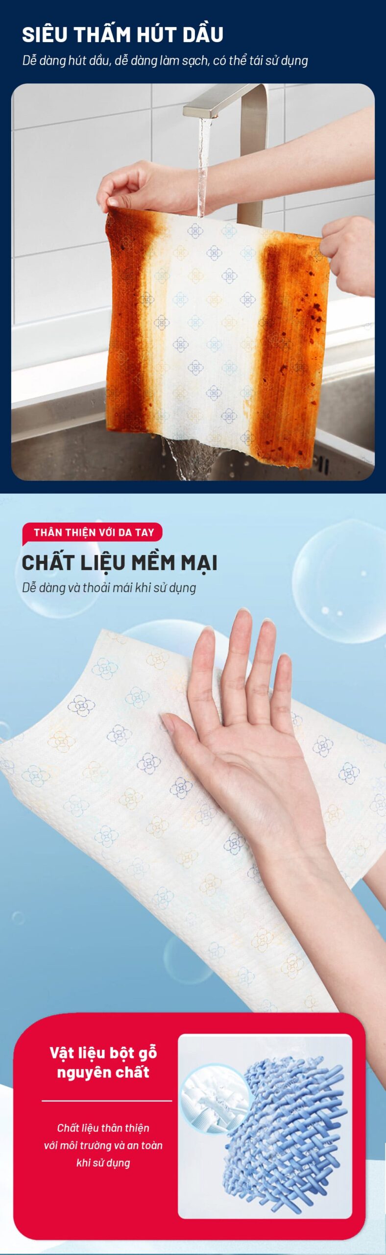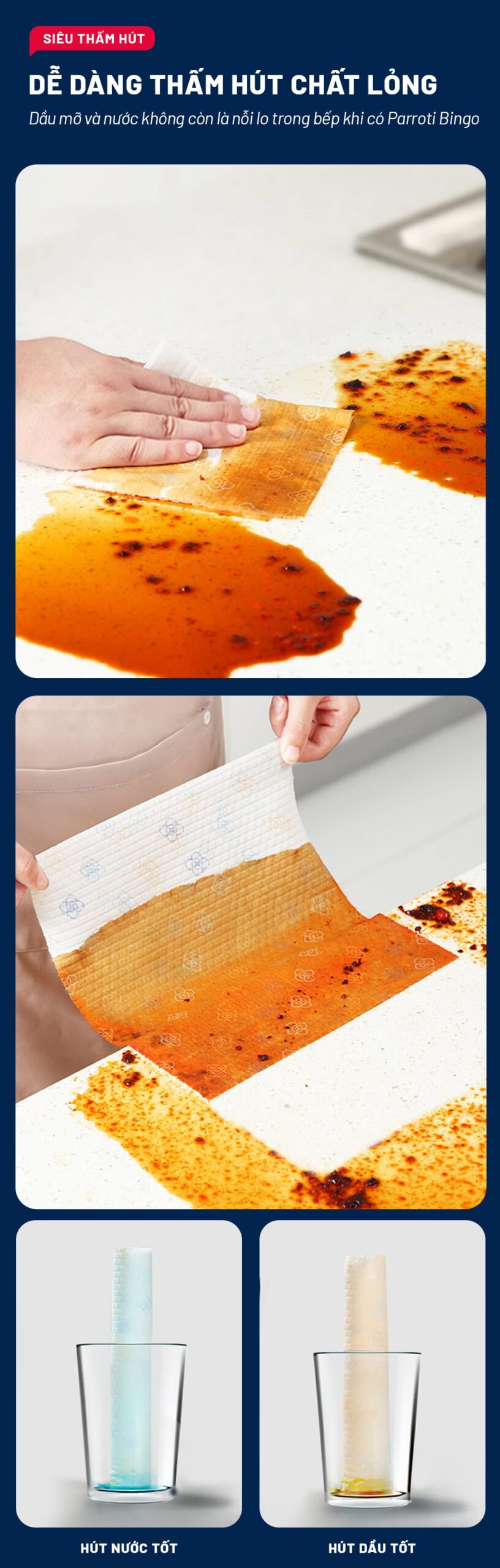 – Khả năng thấm hút cực tốt, đặc biệt là dầu mỡ