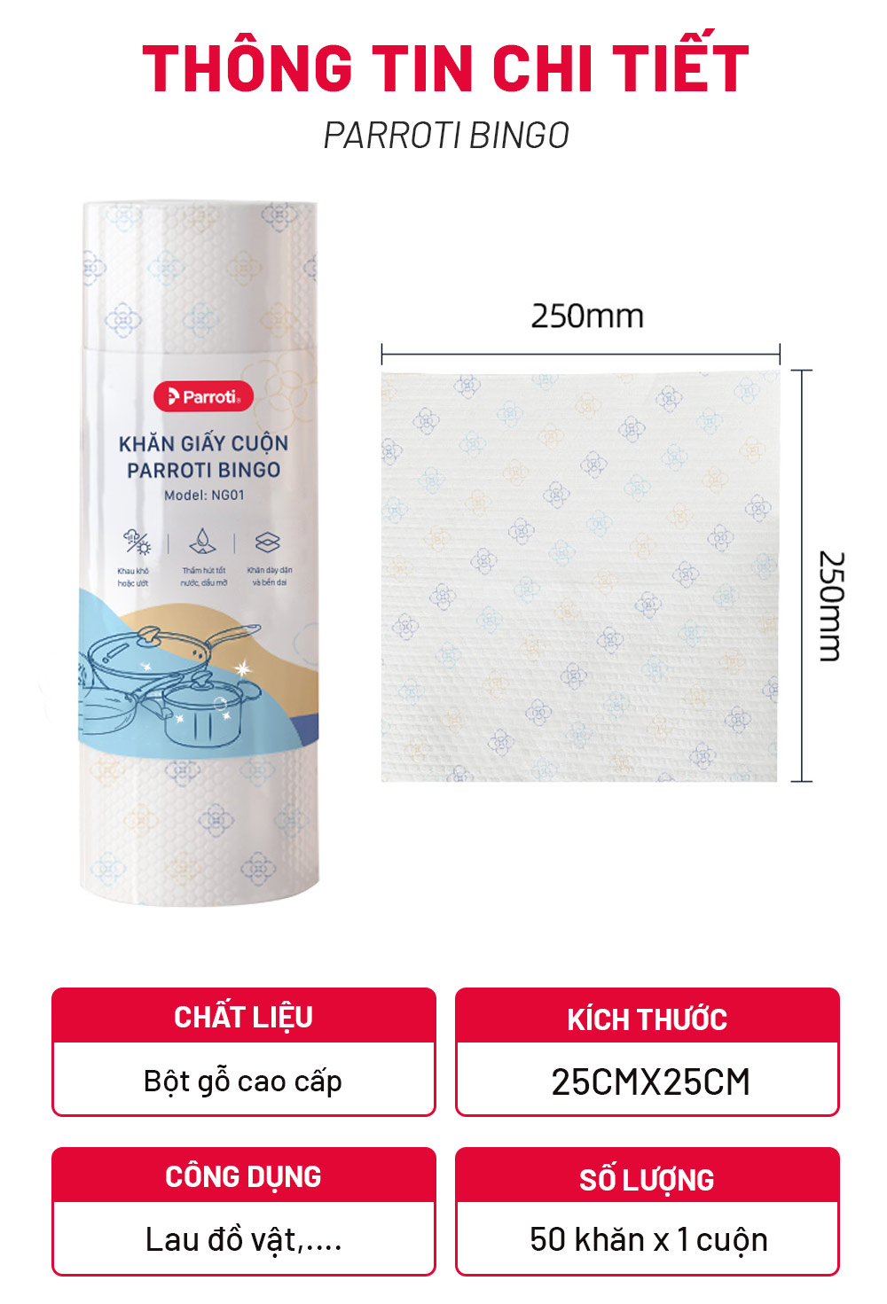 Cuộn khăn giấy lau đa năng 50 khăn 25x25cm Parroti Bingo NG01