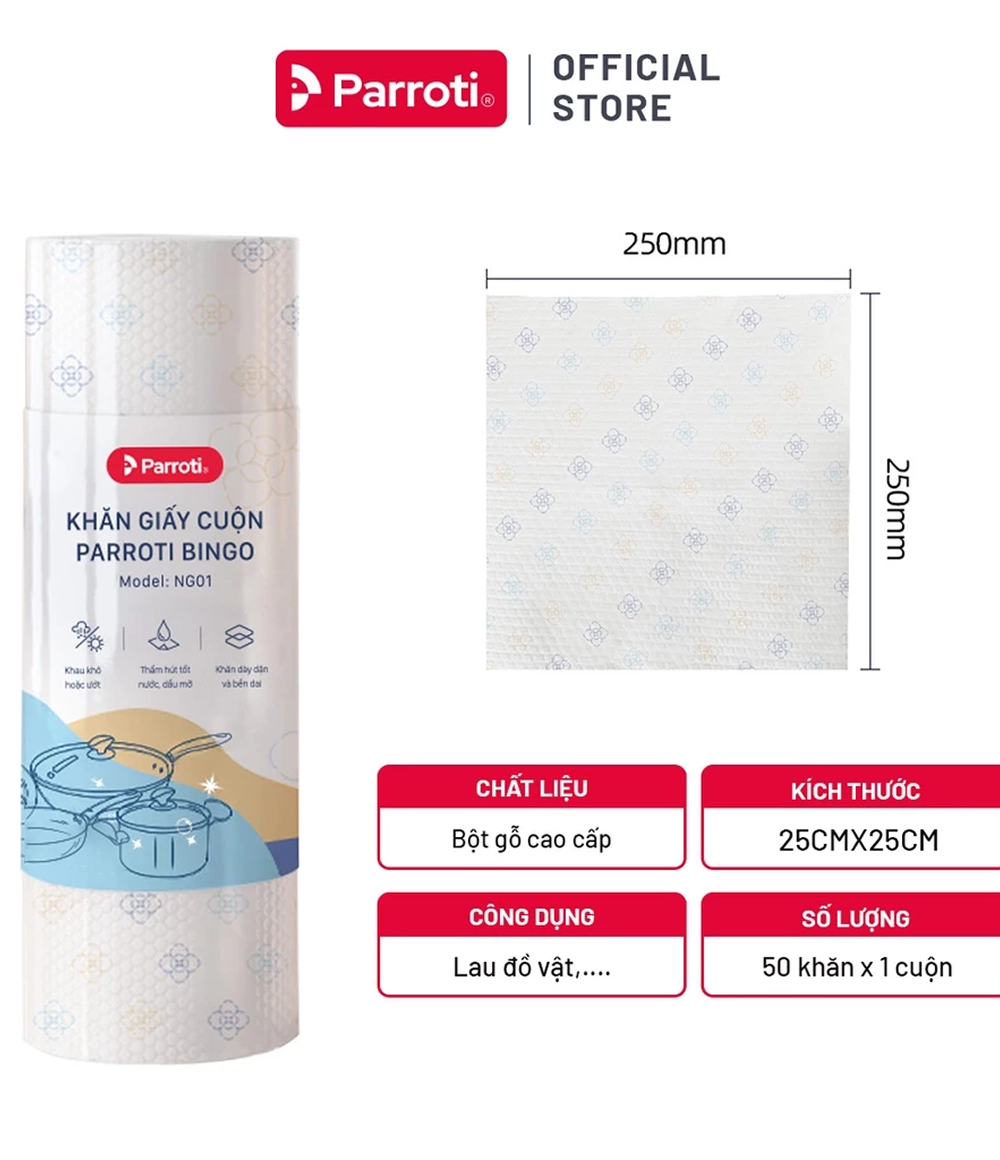 Cuộn khăn giấy lau đa năng 50 khăn 25x25cm Parroti Bingo NG01