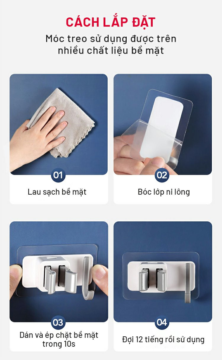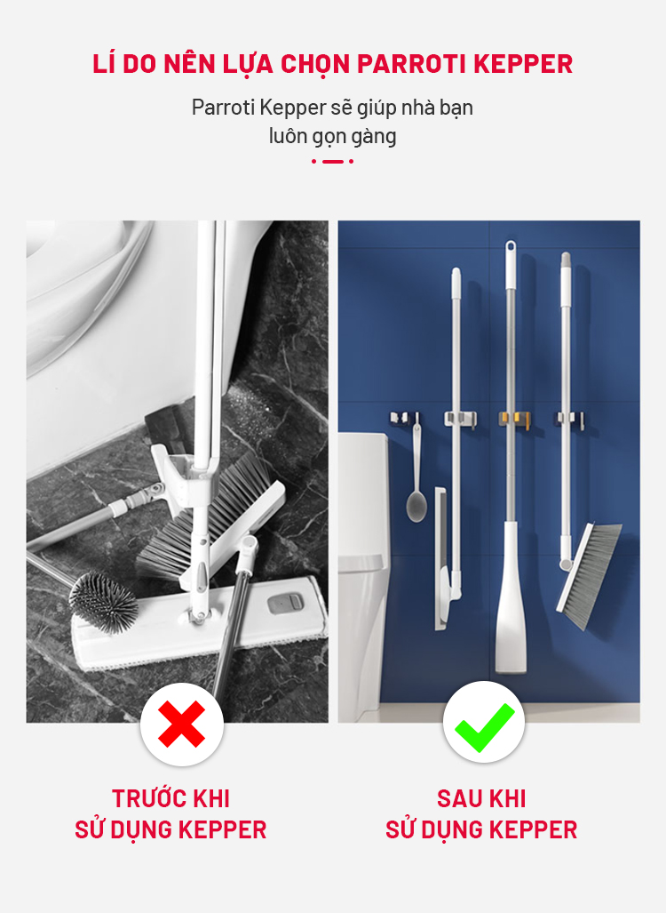 – Treo được nhiều dụng cụ khác nhau như chổi lau nhà, cây lau nhà hoặc cọ bồn cầu.