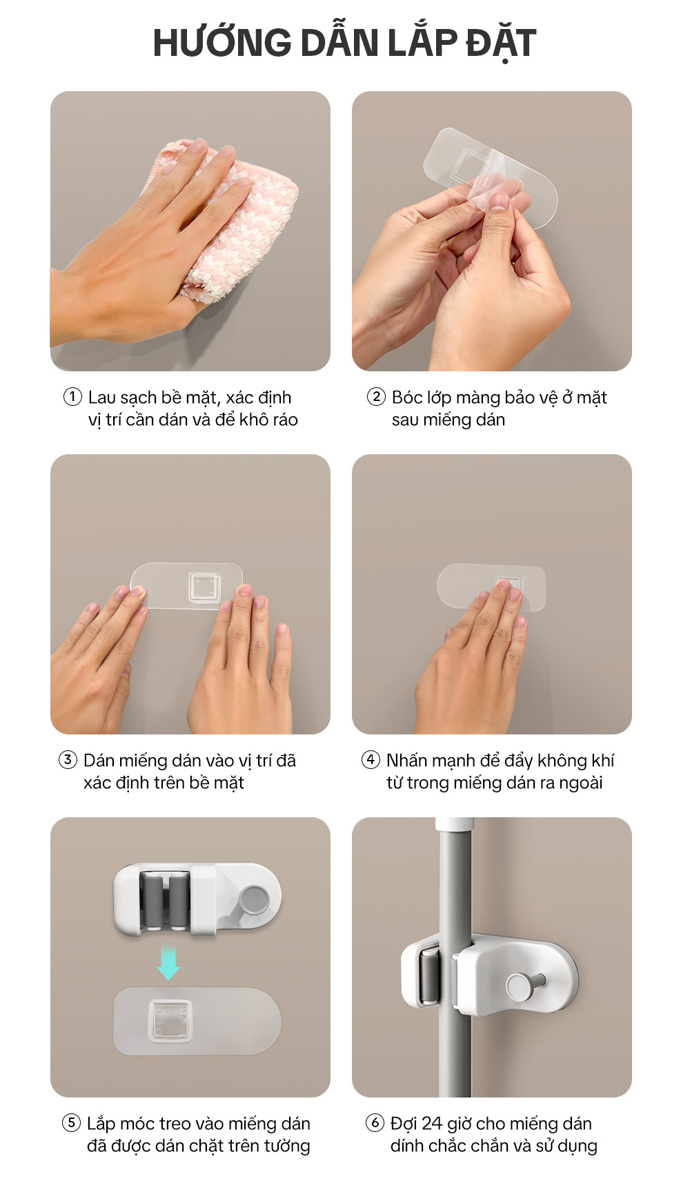 – Bước 1: Làm sạch bề mặt nơi dán móc treo bằng vải khô hoặc vải thấm cồn, bề mặt dán cần khô ráo và sạch bụi
