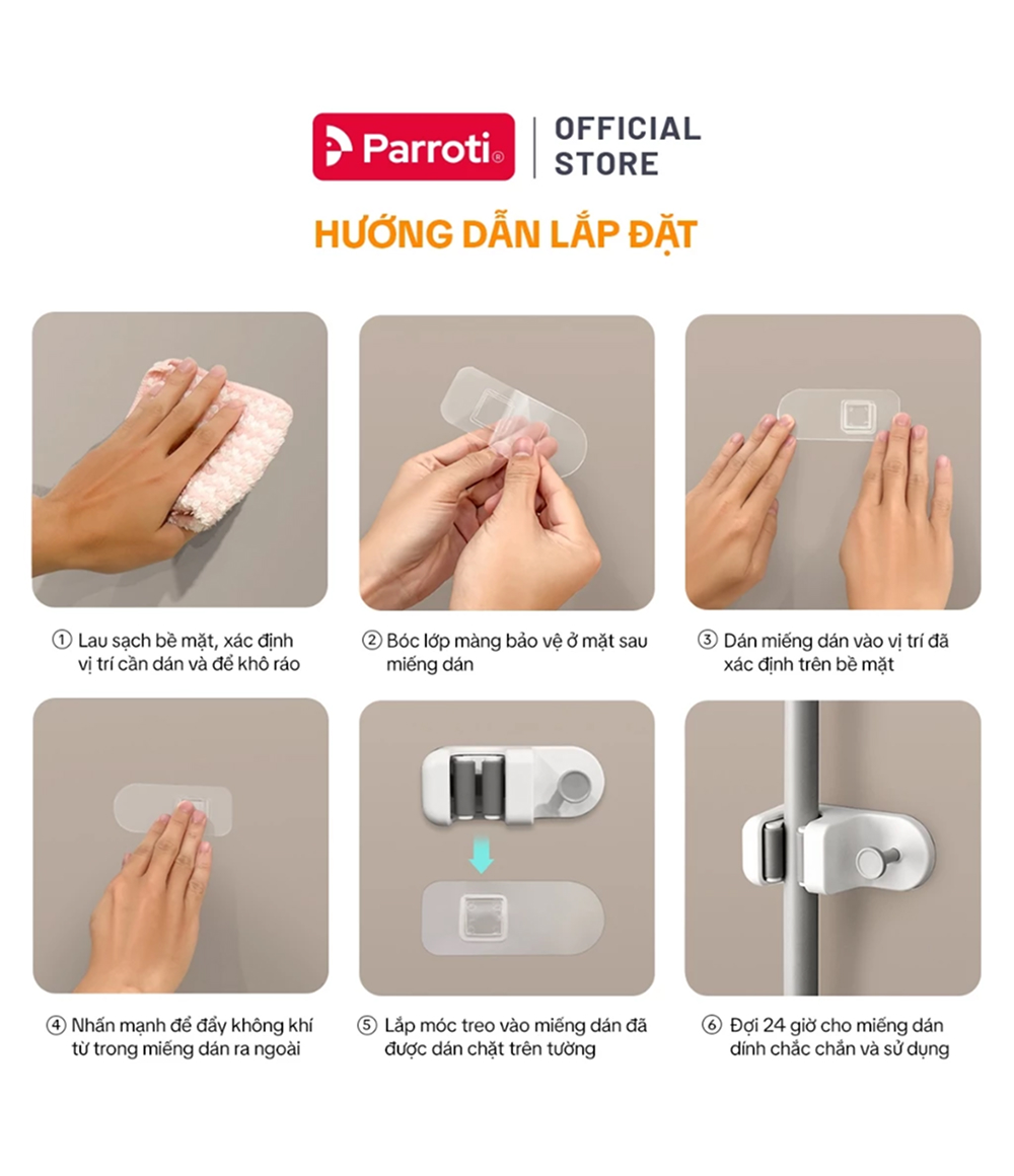 – Bước 1: Làm sạch bề mặt nơi dán móc treo bằng vải khô hoặc vải thấm cồn, bề mặt dán cần khô ráo và sạch bụi