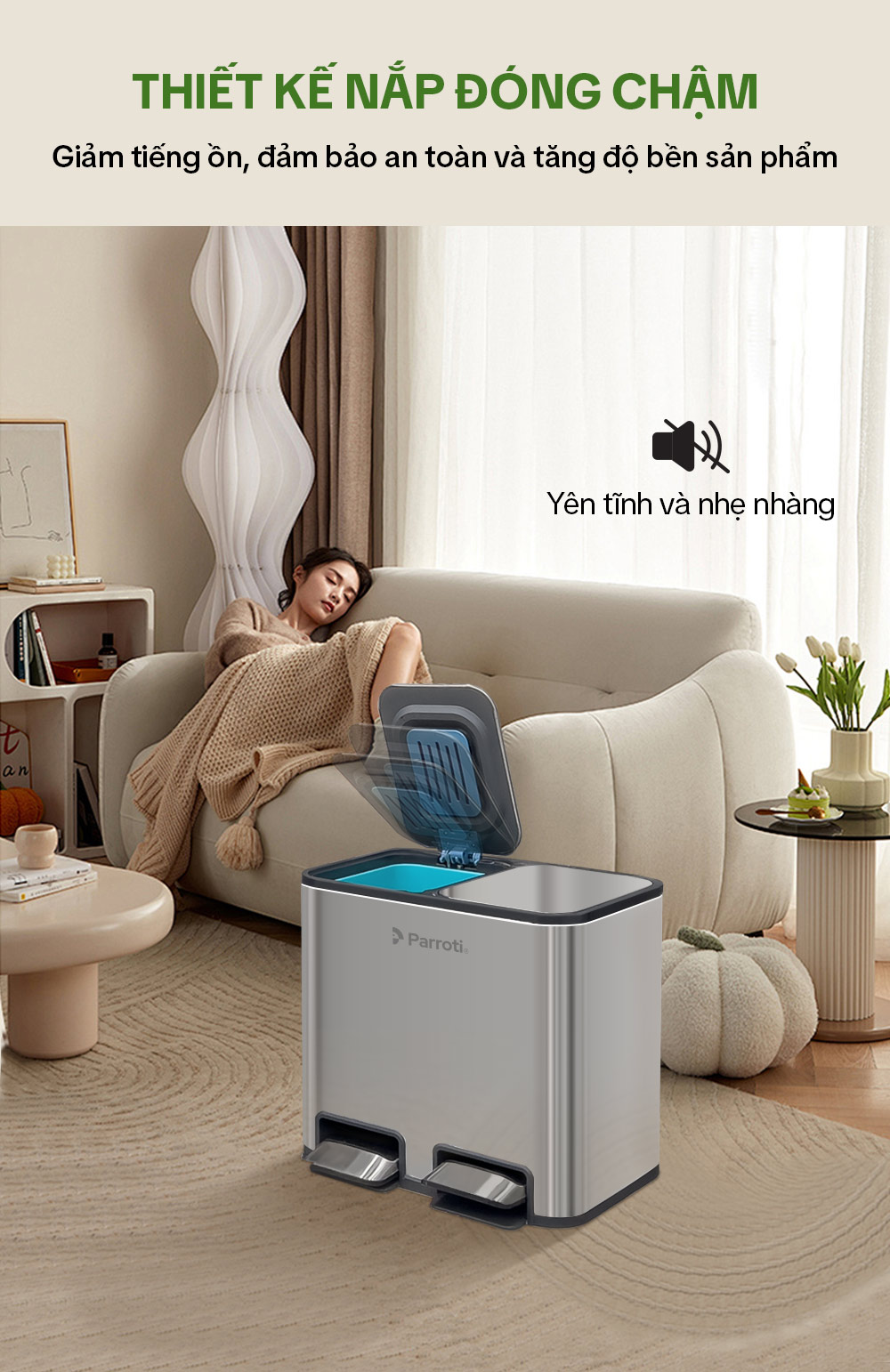 – Thiết kế Nắp thùng rác giảm chấn thông minh giúp đóng nắp từ từ êm ái không gây tiếng ồn.