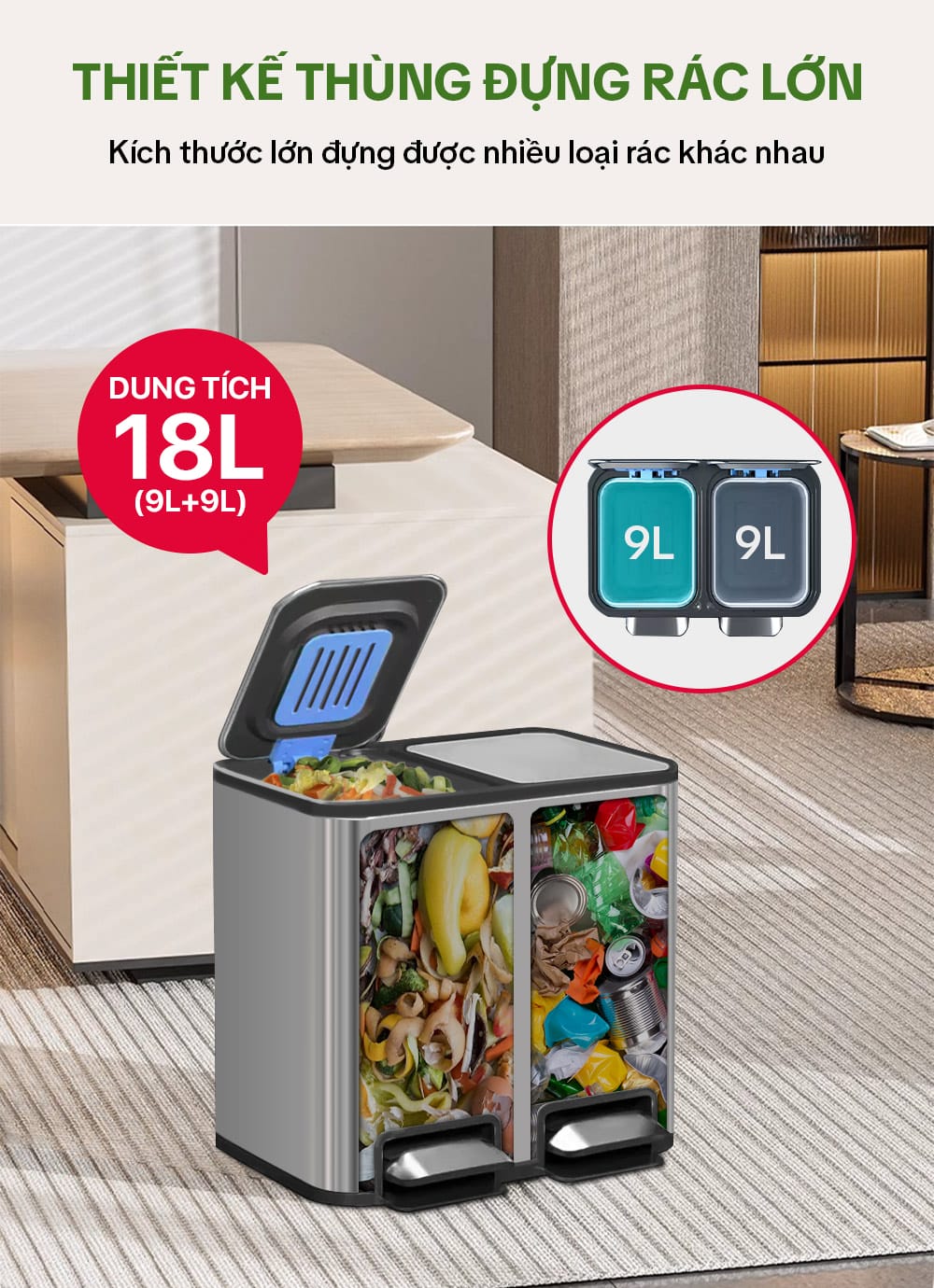 – Dung Tích : 18 Lít / 2 Ngăn – Mỗi Ngăn 9 Lít