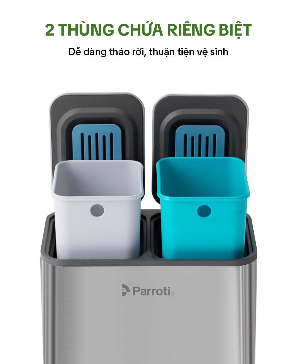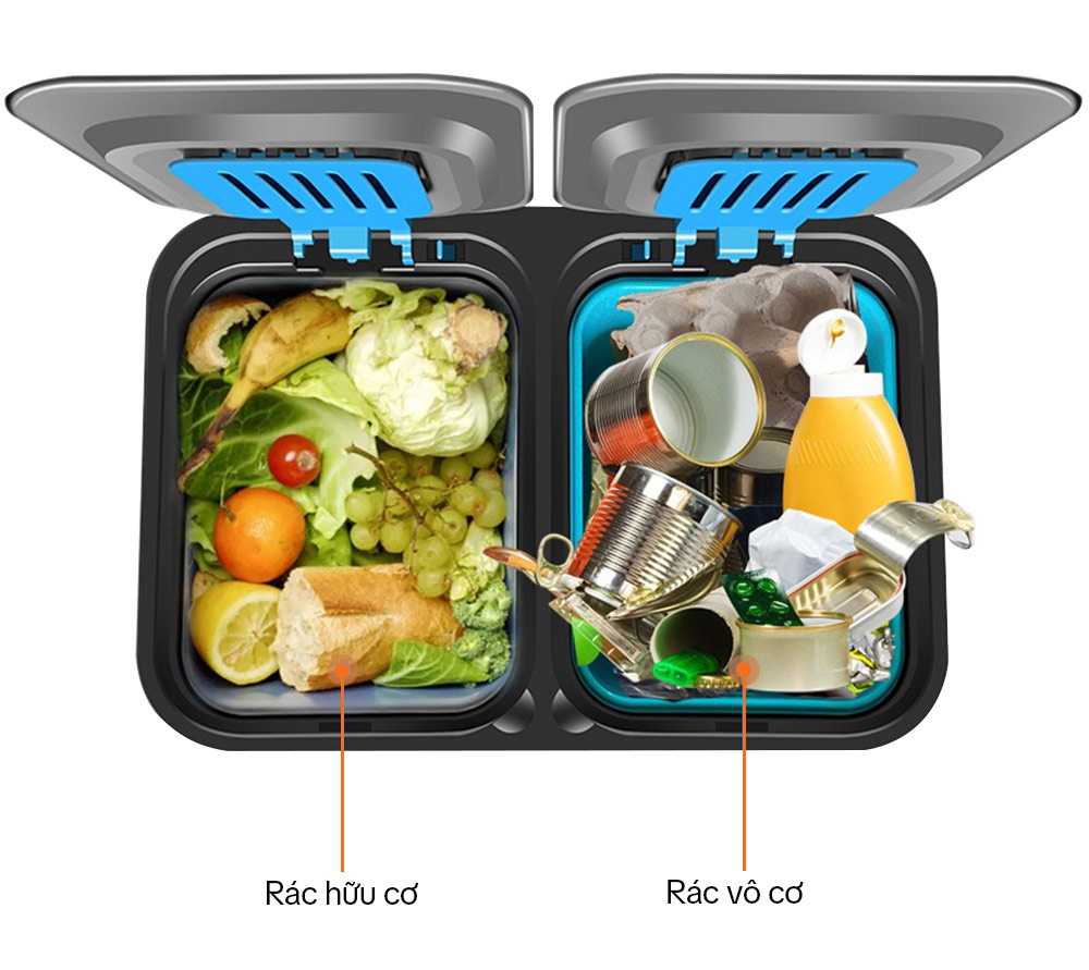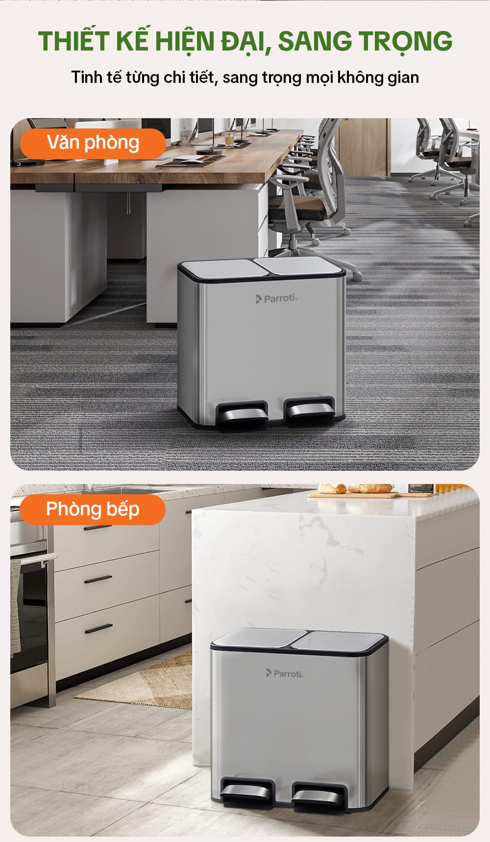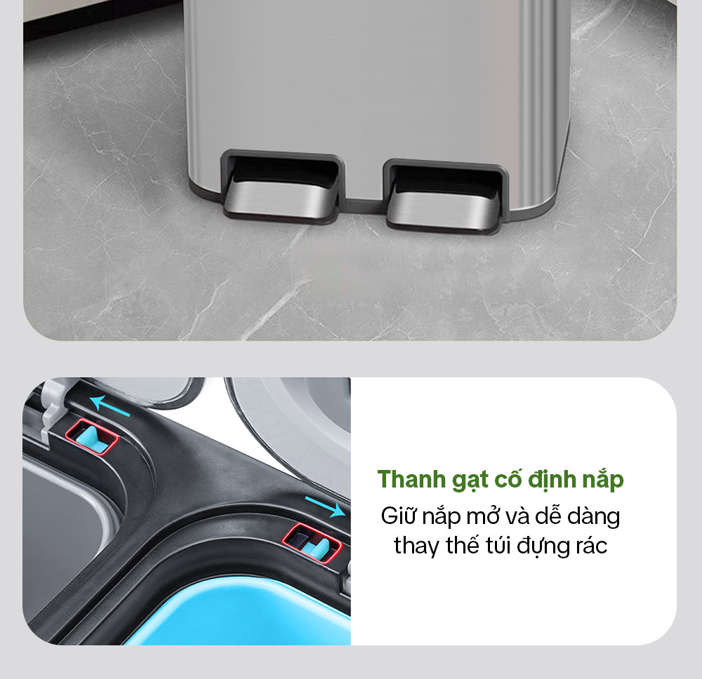 – Thùng rác được thiết kế 2 ngăn phân loại rác với 2 chân đạp riêng biệt tạo sự thuận tiện cho người sử dụng