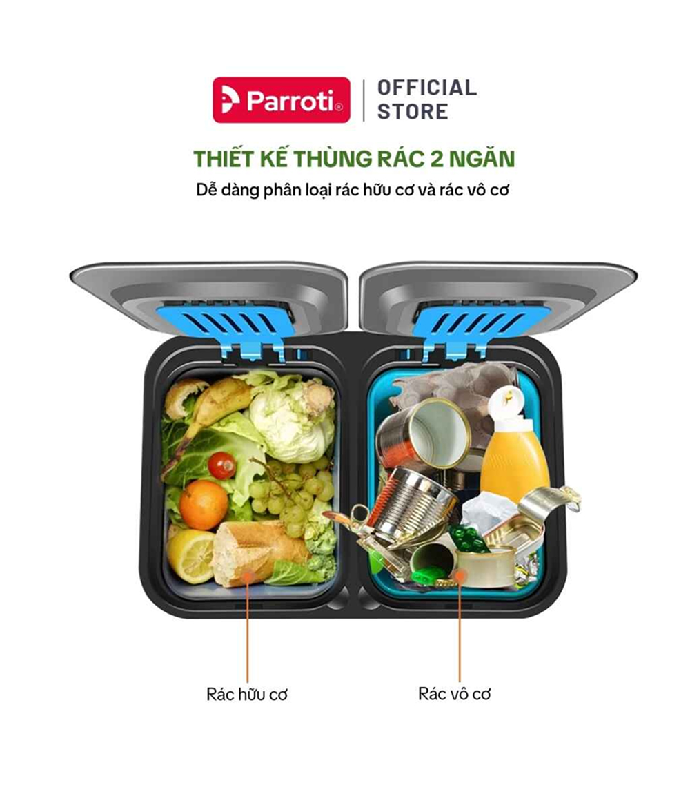 – Thùng rác được thiết kế 2 ngăn phân loại rác với 2 chân đạp riêng biệt tạo sự thuận tiện cho người sử dụng
