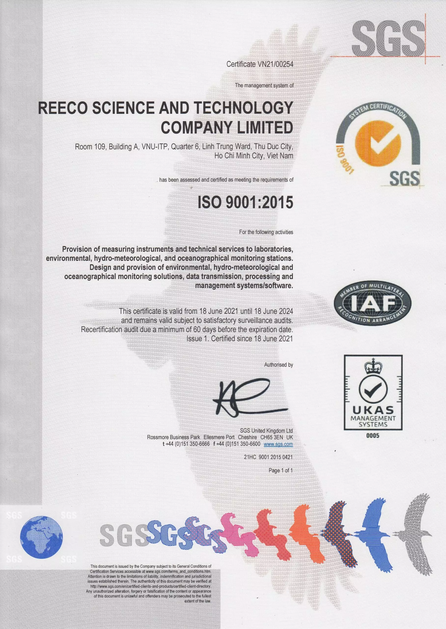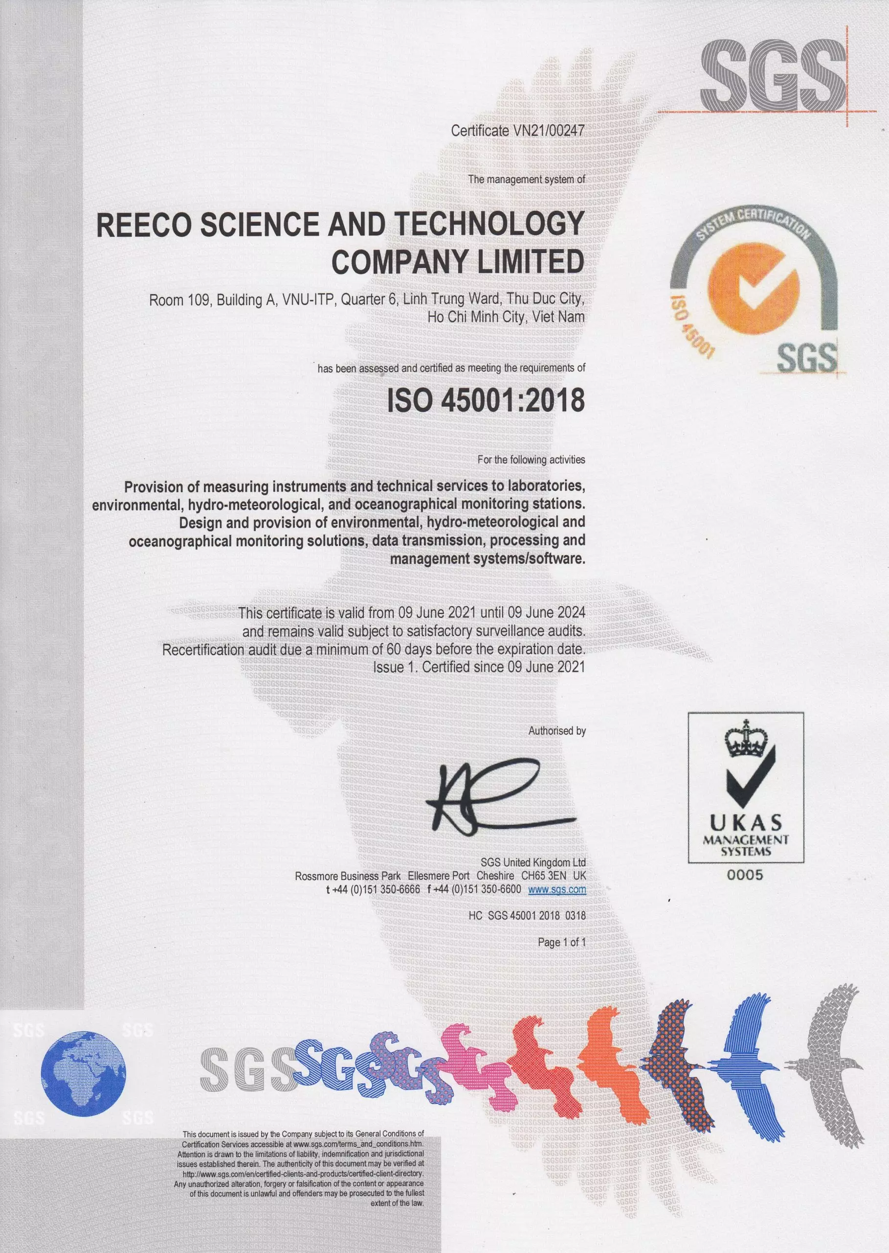 Reecotech tự hào là đơn vị đạt được hai chứng nhận quốc tế: (1) Hệ thống quản lý chất lượng ISO 9001:2015; và (2) Hệ thống quản lý an toàn và sức khỏe nghề nghiệp ISO 45001:2018, được cấp bởi SGS – tổ chức chứng nhận kiểm định chất lượng quốc tế, trụ sở đặt tại Thụy Sỹ.