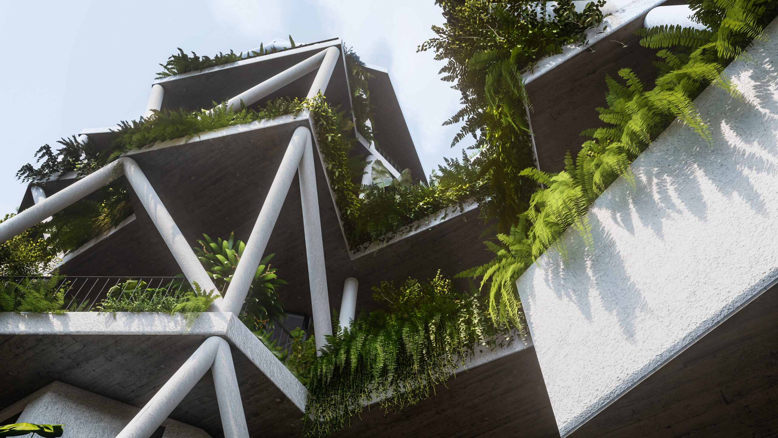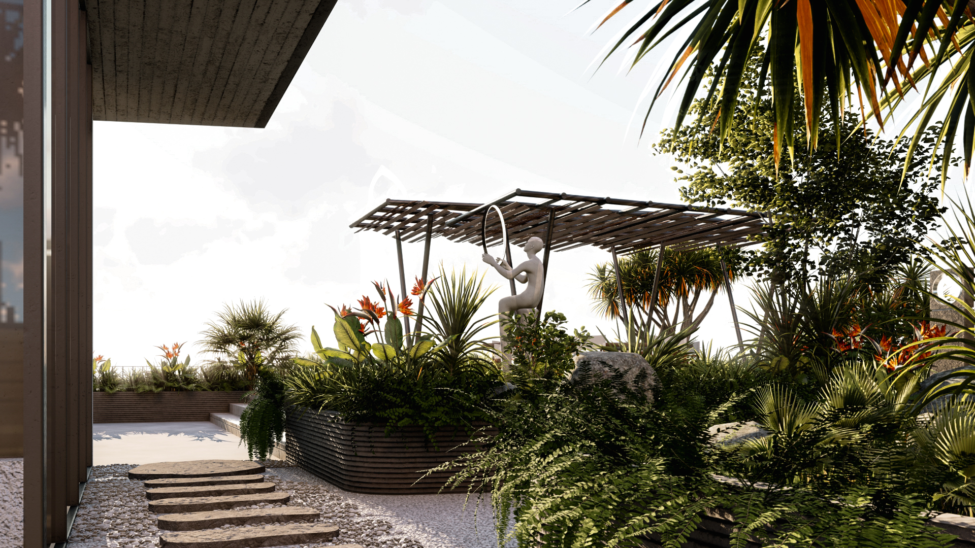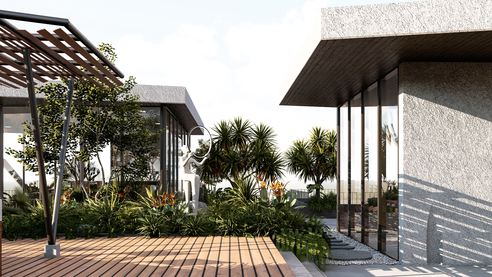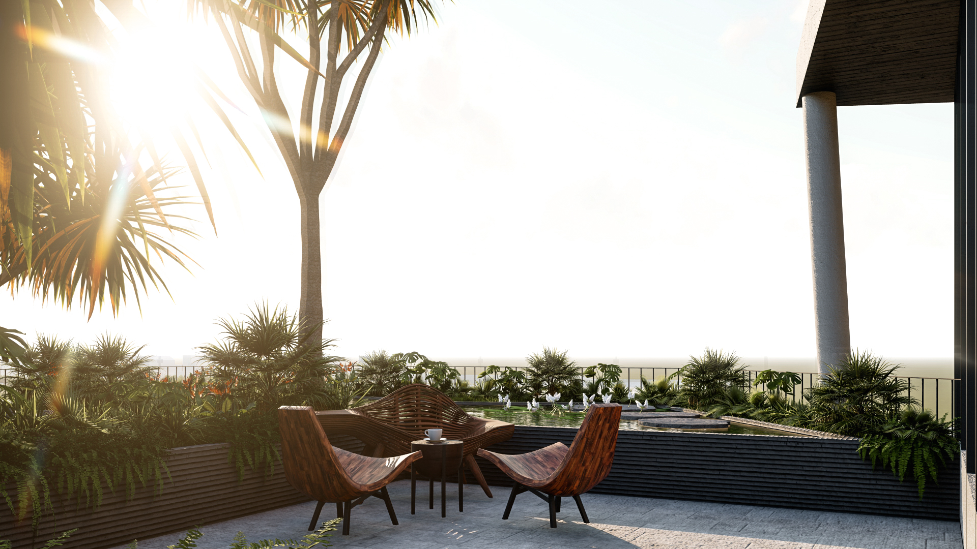 Bối cảnh công trình đặt tại một thành phố biển ở Việt Nam, kết hợp cùng những mong muốn của gia chủ về một không gian sống tràn ngập cây xanh,chúng tôi đưa ra ý tưởng chính trong thiết kế là kết hợp 3 yếu tố: không gian sống, khoảng xanh và ánh sáng. Các yếu tố này luôn hiện diện xen kẽ nhau trong từng ngóc ngách của công trình từ hình thức kiến trúc đến các không gian nội thất. Các không gian phụ, hồ cá hay cây xanh bao bọc các không gian bên trong là “lớp vỏ” tốt để tránh tiếng ồn và điều hòa khí hậu cho ngôi nhà.