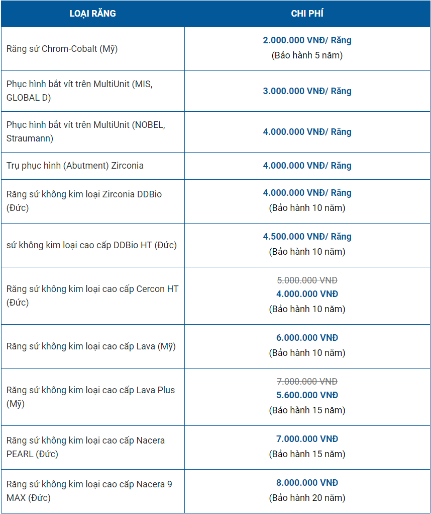 3. Bảng giá phục hình sứ cao cấp trên implant