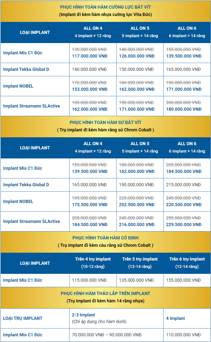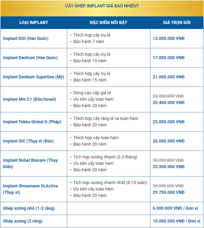 Lưu ý: Nhiều Cô Chú, Anh Chị thắc mắc trên thị trường có nhiều Nha khoa để giá làm răng Implant trọn gói chỉ 6tr, 9tr…thì đây chỉ là chi phí của trụ Implant chưa bao gồm giá Abutment + răng sứ + các chi phí phát sinh khác.