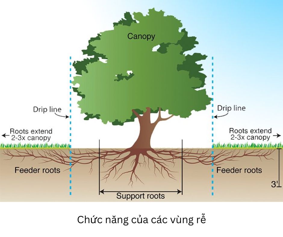 Vùng rễ từ gốc đến giữa tán (vùng 1): có chức năng chính là neo đậu, giúp cây đứng vững và dẫn truyền dinh dưỡng.