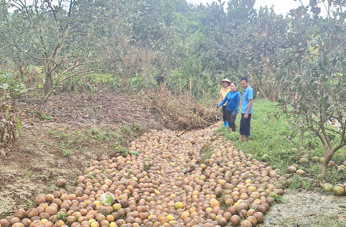 Sau khi nước lũ rút, những vườn bưởi của người dân ở xã Xuân Vân, huyện Yên Sơn thi nhau rụng quả đầy gốc cây, nhiều hộ gia đình mất cả trăm triệu đồng.