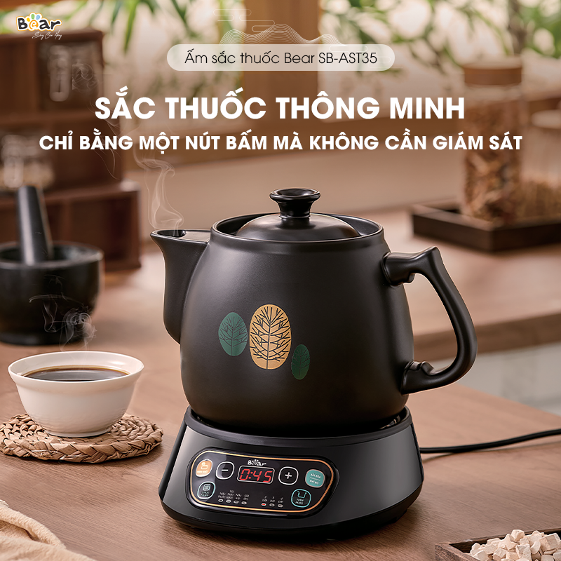 Thiết bị là sự kết hợp hoàn hảo của phương thức sắc thuốc truyền thống và công nghệ hiện đại. Không cần mất công canh chừng, người dùng chỉ cần cho nước và thuốc vào là máy sẽ tự động sắc thuốc đúng chuẩn. Đặc biệt, ấm còn có thể giữ nhiệt tối đa 9 giờ 50 phút cực tiện lợi.