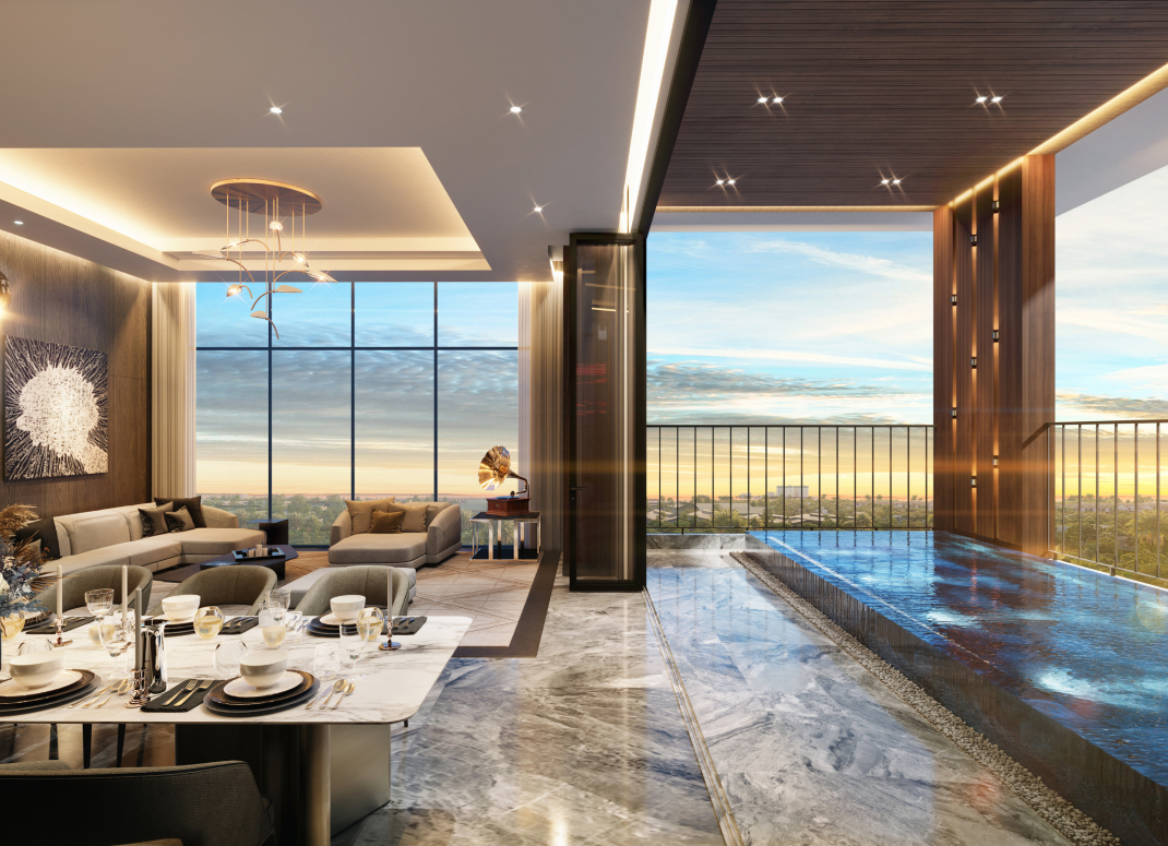 Immerse in luxurious extravagance within the serene resort island amidst the vast sky. The Penthouse apartments epitomize perfection with top-tier amenities such as private swimming pools and panoramic views overlooking the entire city. Additionally, the Sunken floor design fosters a conditions for residents to creatively shape their living space, elevating their personalized signature to new heights.