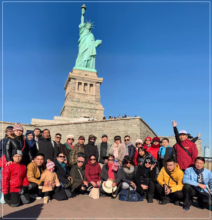 Đoàn khách Vietmytourist chụp hình dưới chân Tượng Nữ thần Tự Do