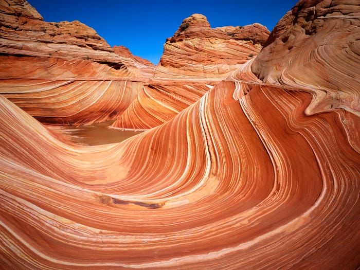 Sườn núi Coyote Buttes nằm ở ranh giới giữa bang Arizona và Utah, miền Tây Nam nước Mỹ, được biết đến bởi những ngọn núi đa sắc hình sóng uốn lượn mang tên The Wave. Để bảo tồn vẻ đẹp tự nhiên, mỗi ngày chỉ có 20 du khách được tham quan nơi đây. Trải qua 190 triệu năm, những cồn cát xếp chồng lên nhau. Sự lắng đọng của muối và canxi tạo nên những lớp đá nhiều màu sắc như đỏ, cam, vàng, tím… Nước, gió và những kiến tạo địa chất đã tạo nên The Wave với những hang và kẽ nứt kỳ bí. Vào mỗi buổi sáng khi ánh mặt trời chiếu rọi vào, những tia nắng xuyên qua những khe núi đá tạo nên những cảnh tượng đá biến đổi màu sắc tuyệt vời, khiến du khách như lạc vào thế giới khác.