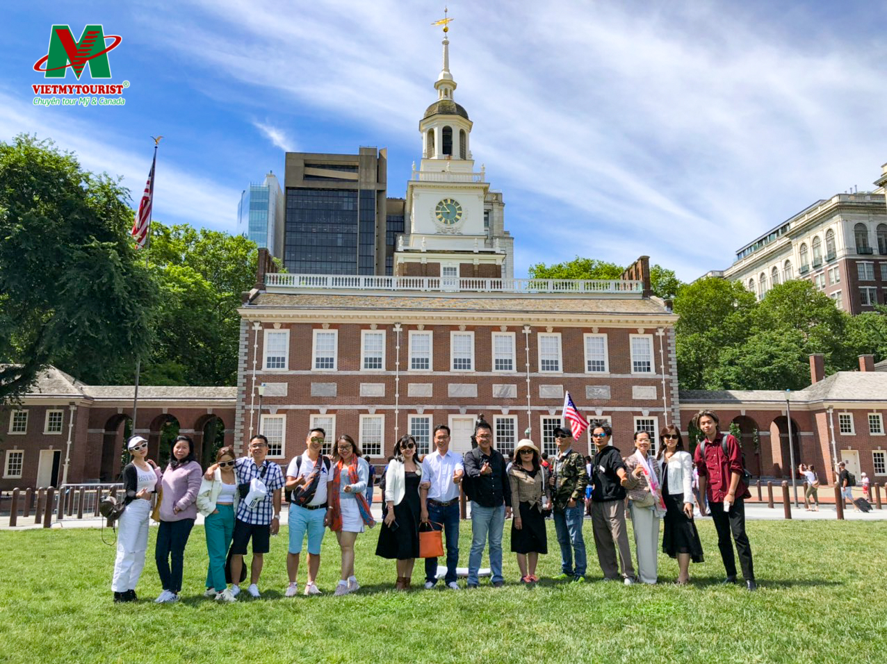 - Đoàn tham quan Dinh Độc Lập (Independence Hall) – Hiện nay tòa nhà được bảo tồn nguyên vẹn, trước đây nơi này diễn ra cuộc họp thống nhất 13 bang của nước Mỹ và là nơi diễn ra rất điều sự kiện lịch sử quan trọng của buổi đầu khai sinh Hoa Kỳ. Nơi đây cũng chính là trụ sở của Lưỡng viện Quốc hội Mỹ thời kỳ non trẻ.