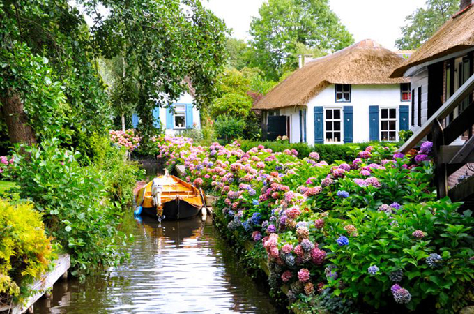 Nằm tại tỉnh Overijssel của Hà Lan, Giethoorn là ngôi làng nổi tiếng với tên gọi “Venice của phương Nam hay “Venice của Hà Lan. Bởi lẽ, nơi đây có kênh đào trải dài 7,5km khắp làng. Giethoorn vốn không có đường cái, bạn sẽ không tìm thấy ô tô hay xe bus, thay vào đó, mọi hình thức giao thông chủ yếu bằng đường thuỷ, thông qua kênh đào. Nhờ vậy, những ngôi nhà nhỏ của ngôi làng tuyệt đẹp nổi lên giữa mặt nước như một bức tranh vẽ đẹp đến nao lòng…