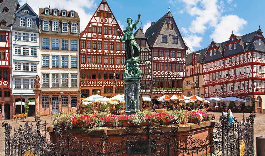 Romerberg Square– quảng trường trung tâm của Frankfurt, nơi tụ họp của dân địa phương trong các lễ hội đặc biệt là lễ giáng sinh. Khu vực này nổi bật với 11 tòa nhà cũ được xây dựng từ thế kỷ 15 – thế kỷ 18 bao gồm Old Town Hall (Altes Rathaus) với Imperial Hall (Kaisersaal), tạo nên một không gian lộng lẫy.
