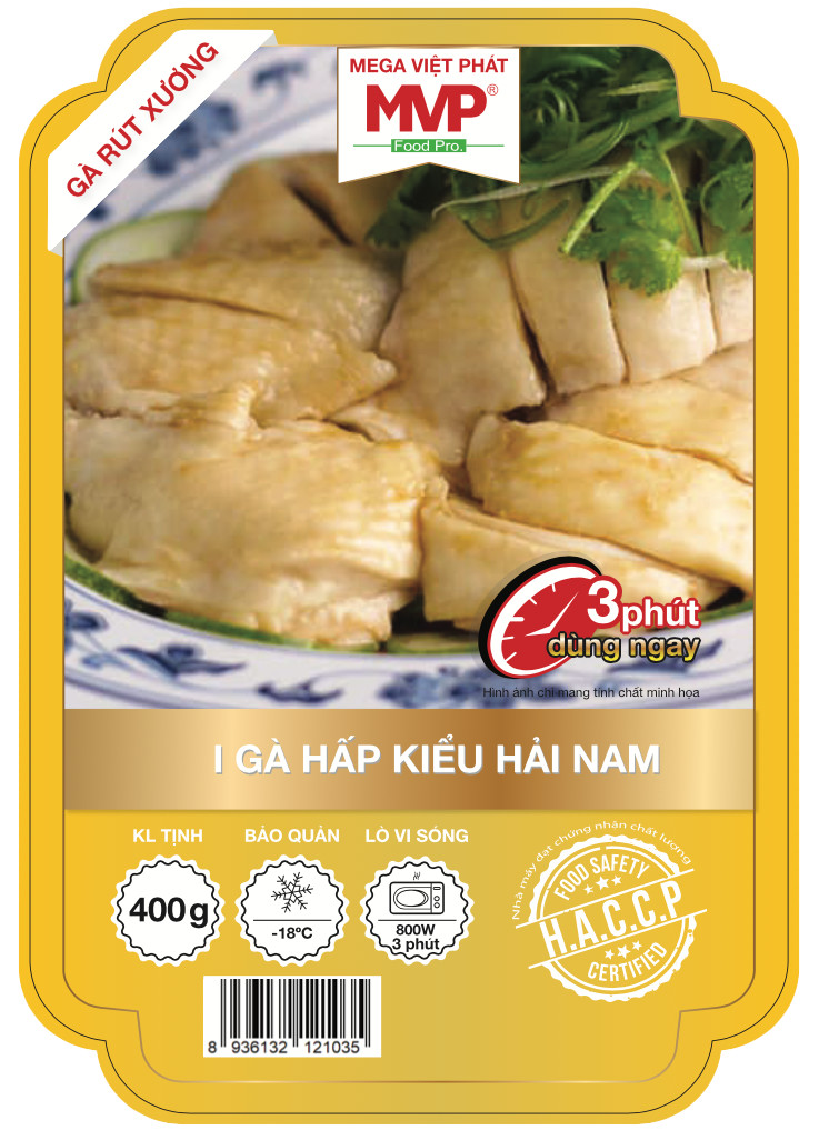 Đùi Gà Hấp Kiểu Hải Nam thuộc dòng sản phẩm Heat & Serve của công ty Mega Việt Phát, được bảo quản đông lạnh, và chỉ cần hâm nóng 4-5 phút trước khi sử dụng.