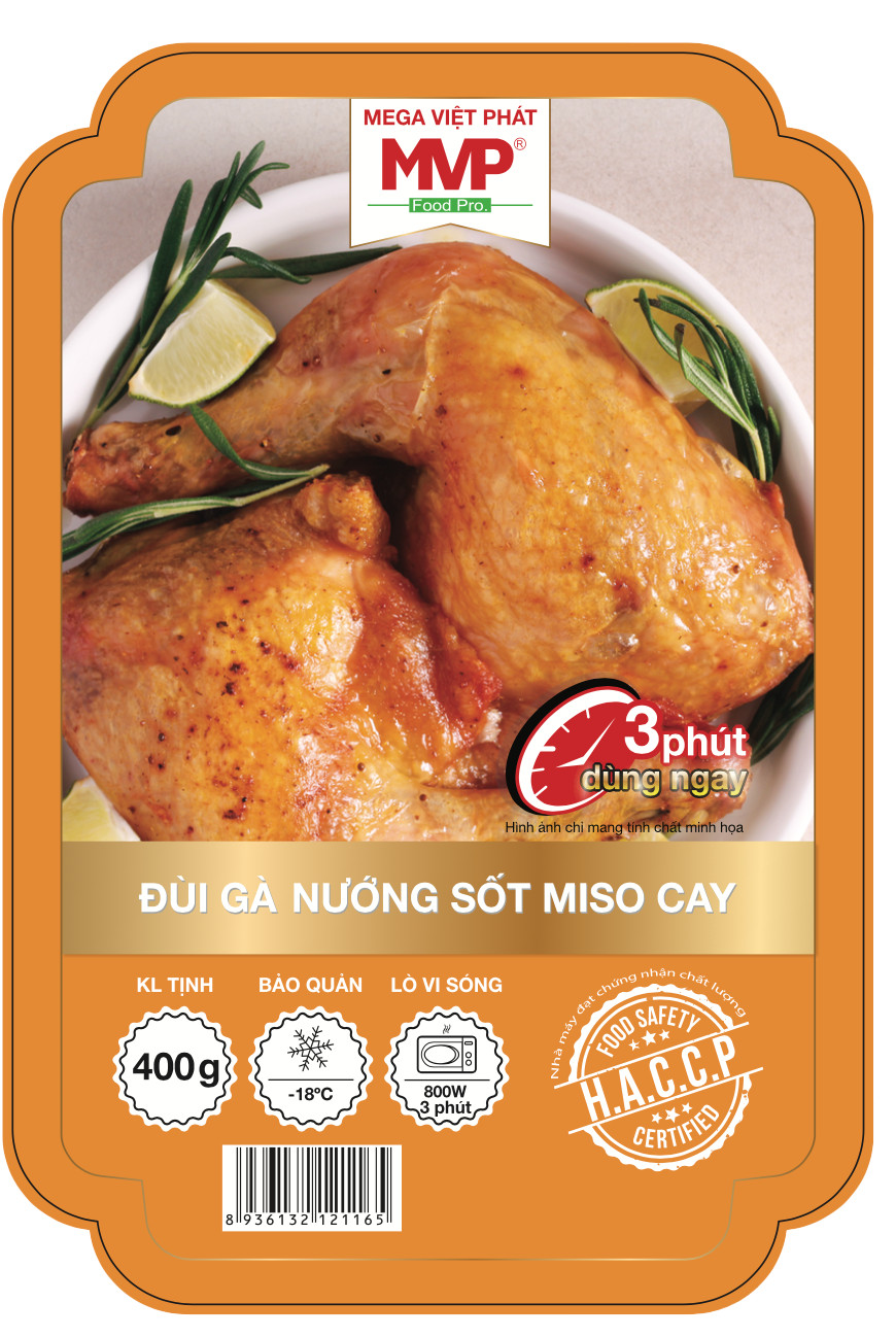 Đùi Gà Nướng Sốt Miso Cay thuộc dòng sản phẩm Heat & Serve của công ty Mega Việt Phát, được bảo quản đông lạnh, và chỉ cần hâm nóng 4-5 phút trước khi sử dụng.