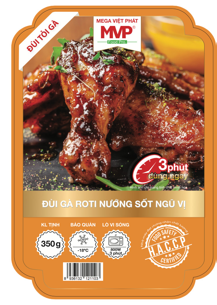 Đùi Gà Roti Nướng Sốt Ngũ Vị thuộc dòng sản phẩm Heat & Serve của công ty Mega Việt Phát, được bảo quản đông lạnh, và chỉ cần hâm nóng 4-5 phút trước khi sử dụng.